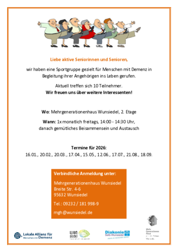 Einmal im Monat trifft sich die Sportgruppe für Menschen mit Demenz und ihre Angehörigen, um gemeinsam in der Gruppe aktiv zu sein. Die Treffen finden freitags von 14:00 bis 14:30 Uhr im Mehrgenerationenhaus Wunsiedel (2. Stock) mit anschließendem Beisammensein und Austausch statt.