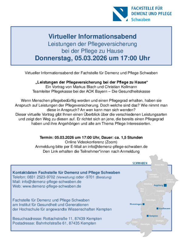 Titel der VeranstaltungVirtueller Informationsabend der FStDP Schwaben "Leistungen der Pflegeversicherung bei der Pflege zu Hause"