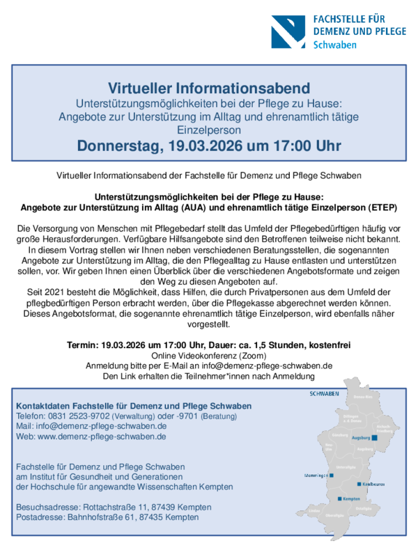 | Titel der Veranstaltung | Virtueller Informationsabend der FStDP Schwaben "Unterstützungsmöglichkeiten bei der Pflege zu Hause - Angebote zur Unterstützung im Alltag und ehrenamtlich tätige Einzelperson" |