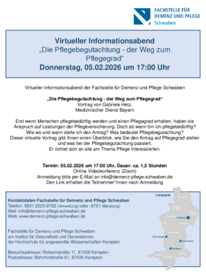 | Beschreibung | Virtueller Informationsabend der Fachstelle für Demenz und Pflege Schwaben Die Pflegebegutachtung - der Weg zum Pflegegrad Vortrag von Gabriele Hetz, Medizinischer Dienst Bayern Erst wenn Menschen pflegebedürftig werden und einen Pflegegrad erhalten, haben sie Anspruch auf Leistungen der Pflegeversicherung. Doch ab wann bin ich pflegebedürftig? Wie wo und wann stelle ich den Antrag? Was bedeutet Pflegebegutachtung? Dieser virtuelle Vortrag gibt Ihnen einen Überblick, wie Sie den Antrag auf Pflegegrad stellen und was bei der Pflegebegutachtung passiert. Er richtet sich an alle am Thema Pflege Interessierten. |