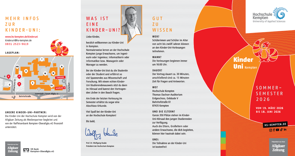 Weitere Informationen zur Kinder-Uni der Hochschule Kempten finden Sie unter folgendem Link https://www.hs-kempten.de/hochschule/hochschule-erleben/kinder-uni-in-kempten